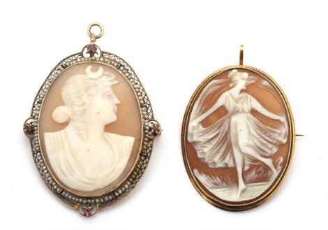 To kamébrocher/vedhæng af 10 og 14 kt. guld. Samlet vægt ca. 10,5 g. L. inkl. øskner 4,4-5 cm. (2)