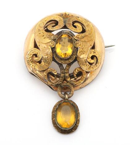 Broche af metal belagt med 10 kt. guldfolie prydet med to oval facetslebne gule glassten. Ca. 3 x 4,7 cm.