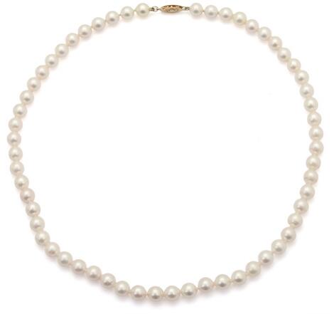 Perlehalskæde prydet med talrige kulturperler og lås af 18 kt. guld. Perlediam. ca. 6,5-7 mm. L. 53 cm.