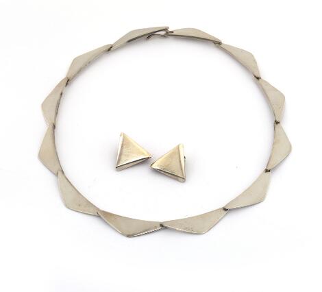 Hans Hansen, Bent Eriksen: "Peak" halskæde af sterlingsølv, samt et par øreclips af sterlingsølv. L. 36 cm. (3)