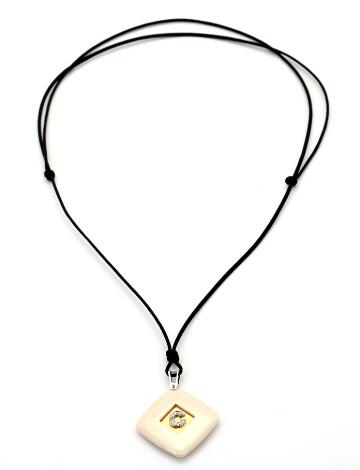 Diamantvedhæng af keramik samt 18 kt. guld og hvidguld prydet med diamanter. På sort snor. Justérbar længde.