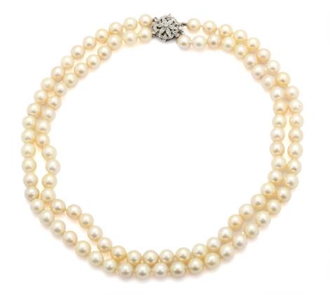 Dobbetlradet perlehalskæde prydet med talrige kulturperler og diamantlås af 9 kt. hvidguld. L. 42 cm.