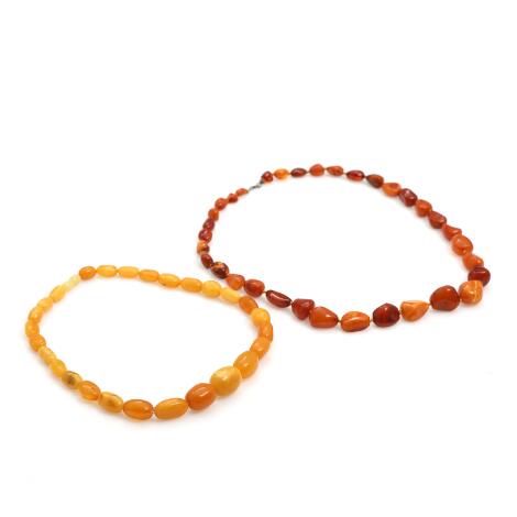 To ravhalskæder hver prydet med talrige polerede ravklumper. L. 51-65 cm. (2)