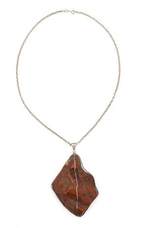 Halskæde af sterlingsølv med ravvedhæng prydet med upoleret rav. Samlet vægt ca. 67,5 g. L. 49,5 cm.