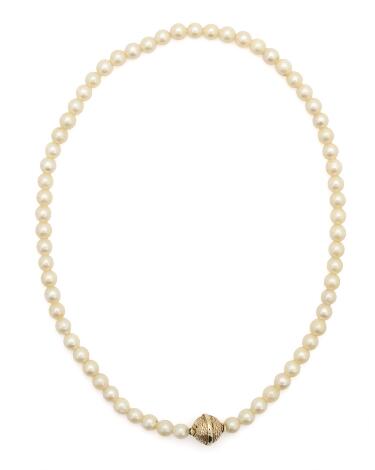 Lang perlehalskæde prydet med talrige kulturperler og perlelås af 14 kt. guld. Perle diam. 5,6-6,7 mm. L. 78 cm.