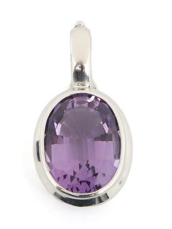 Ametystvedhæng af 14 kt. hvidguld prydet med oval facetslebet ametyst. L. inkl. øsken 3,1 cm.