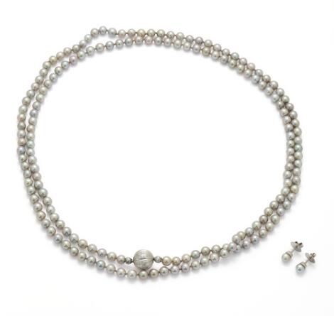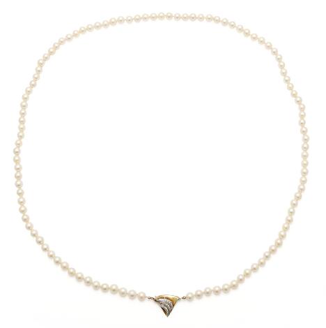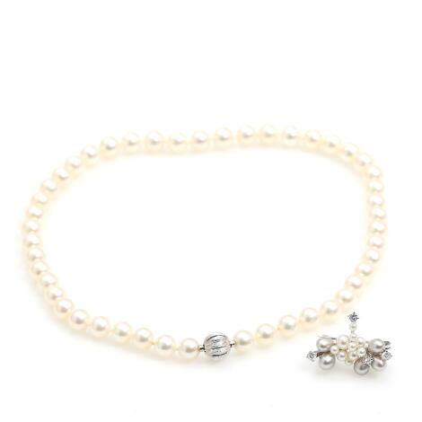 Jürg Heinz: Perle- og diamantlås af 14 kt. hvidguld, kuglelås af 14 kt. hvidguld samt perlehalskæde. (2)