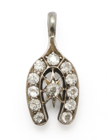 Diamantvedhæng af 8 kt. guld og sølv i form af hestesko prydet med talrige old-cut diamanter. L. 2 cm.