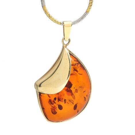 Ravvedhæng af 14 kt. guld prydet med rav, kæde af 14 kt. guld og hvidguld medfølger. L. 45 cm.