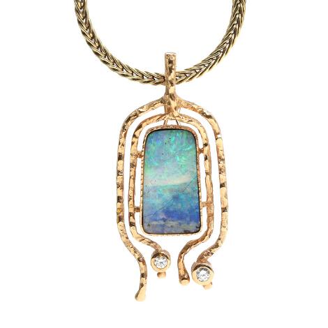 Toftegaard: Opal- og diamantvedhæng af 14 kt. guld prydet med opal og diamanter, kæde af 14 kt. guld medfølger. L. 45 cm.