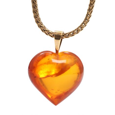 A. F. Rasmussen: Hjerteformet ravvedhæng af 14 kt. guld samt halskæde af 14 kt. guld. L. 3,7 og 41 cm.