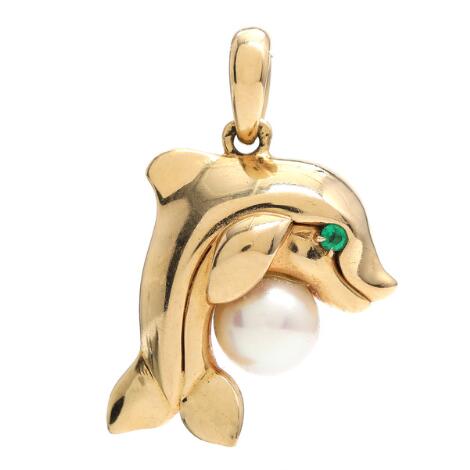 Cartier: Delfin-vedhæng af 18 kt. guld prydet med kulturperle og facetslebne smaragder. L. 2,8 cm.