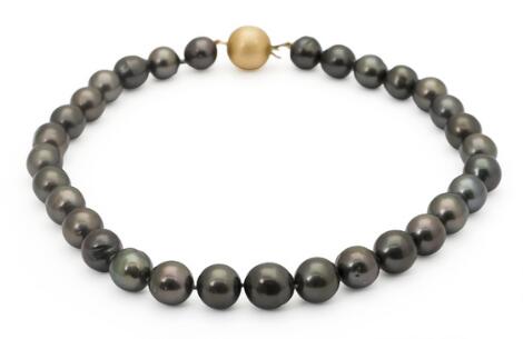 Tahiti perlehalskæde prydet med talrige Tahiti kulturperler og kuglelås af 18 kt. satineret guld. L. 46 cm.
