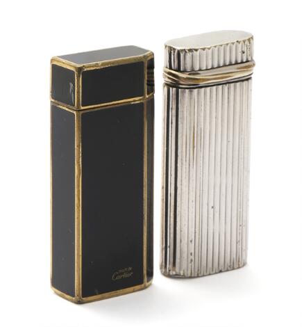 Cartier: A "Must de Cartier" gilded lighter set with black laquer and a "Trinity" lighter set with tri-coloured gilded rings. L. 2.5x6 cm. (2)