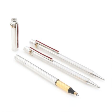 Must de Cartier: Two two ball-point pens and a lead pencil of metal each set a Trinity ring of gold. (3)