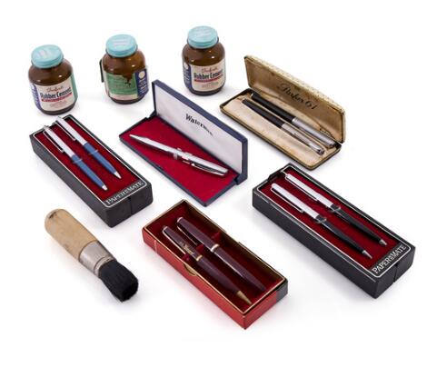 2548/1327LyngbyParker a.o.: A selection of fountain pens, pens and pencils in cases. And three "Rubber Cement" with a brush. (13)