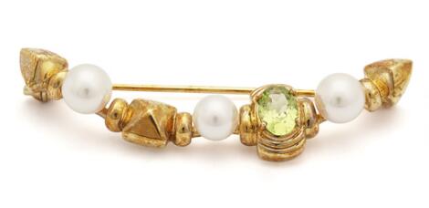 2548/1308LyngbyMikimoto: Peridot- og perlebroche af 18 kt. guld prydet med peridot flankeret af tre perler. L. 5 cm.