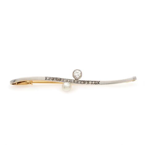 2548/1255AarhusDiamant- og perlebroche af 18 kt. guld og platin prydet med diamanter og perle. L. 6,2 cm.