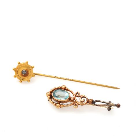 2548/1256AarhusTo brocher af 14 kt. guld henholdsvis prydet med diamant og smykkesten. L. 3,7-5,3 cm. (2)
