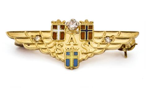 2548/1202Lyngby"SAS" diamantbroche af 18 kt. guld prydet med tre enkeltslebne diamanter samt farvet emalje. L. 25 mm.