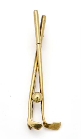 2548/1159LyngbyPovl Klarlund: Broche af 18 kt. guld i form af golfkøller og bold. Vægt ca. 5,6 g. L. 5,2 cm.