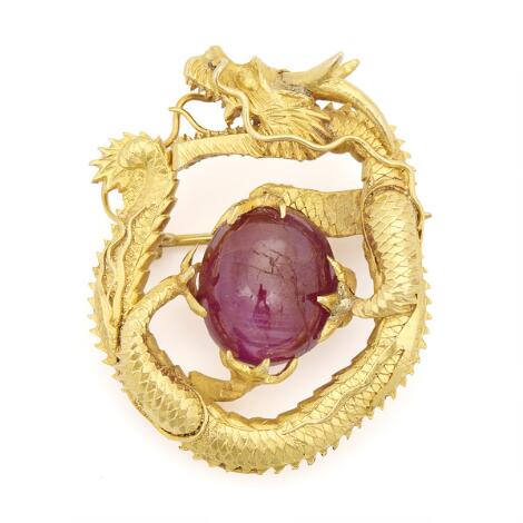 2548/1193LyngbyRubinbroche af 14 kt. guld i form af drage prydet med cabochonslebet delvis stjernerubin. Vægt ca. 9 g. L. 27 mm.