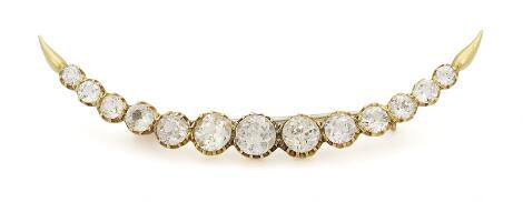 2548/1228LyngbyMåneformet broche 18 kt. guld prydet med talrige facetslebne farveløse sten. Vægt ca. 5 g. L. 6,4 cm.