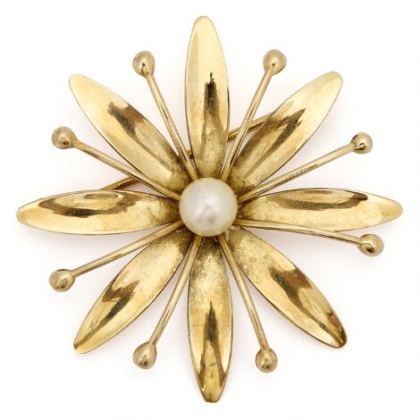 2548/1271LyngbyTh. Skat-Rørdam: Perlebroche af 14 kt. guld i form af blomst prydet med kulturperle. Vægt ca. 5 g. Diam. 3,8 cm.