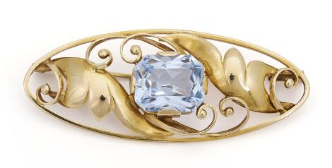 2548/1260LyngbyErik Gunnar Micheelsen: Spinelbroche af 14 kt. guld prydet med facetslebet syntetisk spinel. L. 5 cm.