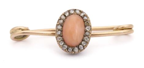 2548/1220LyngbyKoralbroche af 14 kt. guld prydet med cabochonslebet koral talrige rosenslebne diamanter. Vægt ca. 2,4 g. L 3 cm.