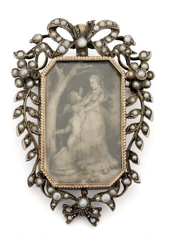 2548/1321LyngbyPerlebroche/vedhæng af guld og sølv i form af fotogemme prydet med talrige flodperler. Ca. 5,3 x 3,6 cm.