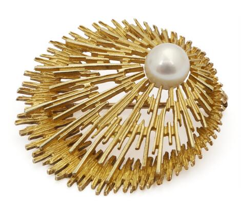 Henning W. Rasmussen: Perlebroche af 14 kt. guld prydet med kulturperle. Vægt ca. 9 g. Diam. 3,2 cm.