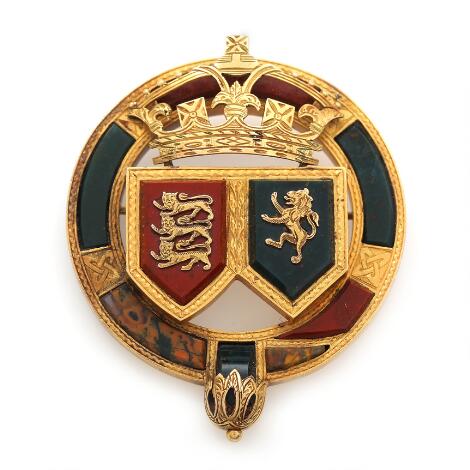 Skotsk broche af 18 kt. graveret guld prydet med talrige polerede blodsten, jaspis og bumble bee jaspis. Diam. 5 cm. Slut 1800-tallet