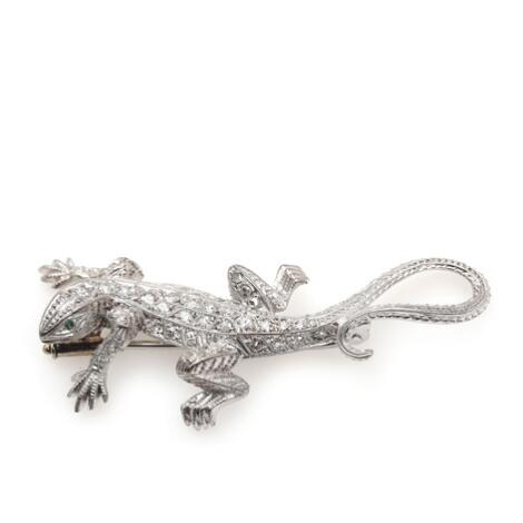 Diamantbroche af 14 kt. hvidguld i form af firben, prydet med talrige diamanter. L. 4,7 cm.