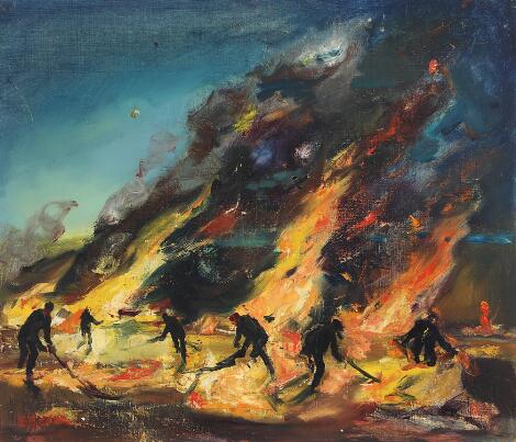 Ib Eisner: "Markerne brændes af, Vallerup". Signed Ib Eisner. Oil on canvas. 61 x 71 cm.