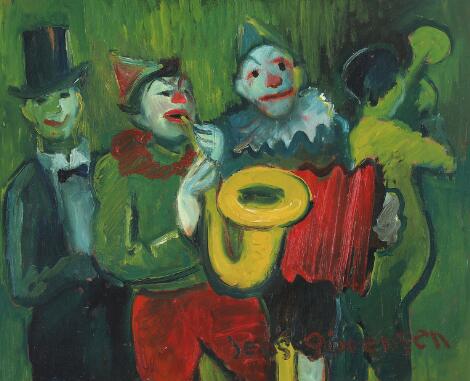 Jens Sørensen: Clowns. Signed Jens Sørensen. Oil on wood. 42 x 50 cm.