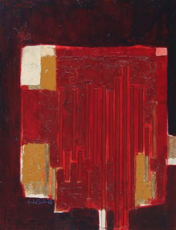 Hugo de Soto: "Archi Teetronical pavane in red", 1968. Signed Hugo de Soto 68. Mixed media on panel. 50 x 39 cm.