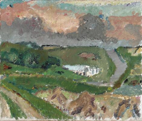 Harald Leth: Sallinglandskab med en gård, 1965. Usigneret. Olie på lærred. 34 x 40 cm.