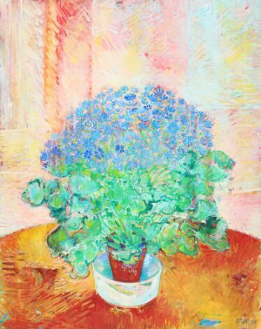 Poul Horsdal: "Opstilling med blå blomst", 1978. Signeret PH 78. Olie på lærred. 100 x 80 cm.