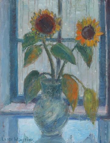 Lasse Winsløw: Opstilling med solsikker ved et vindue. Signeret Lasse Winsløw. Olie på lærred. 62 x 48 cm.