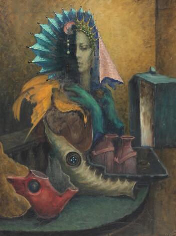 Elsie Ject-Key: Surrealistisk komposition med kvinde. Signeret Elsie Ject-Key. Olie på lærred. 61 x 46 cm.