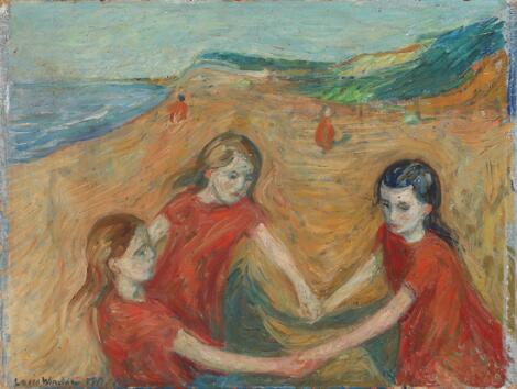Lasse Winsløw: Tre piger på stranden. Signeret Lasse Winsløw 1949. Olie på lærred. 47 x 62 cm. Uindrammet.