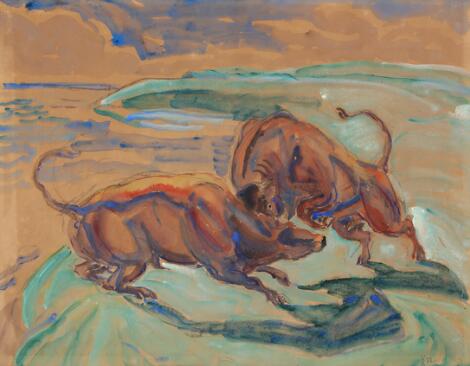Knud Kyhn: To kæmpende tyre. Signeret monogram, 22. Akvarel på papir. 48 x 63 cm.