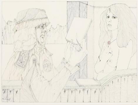 José Madureira Vasconcellos: "Homage A E. Fuchs". Signeret M. Vasconcellos 19. Blyant på papir. Lysmål 30 x 41 cm.