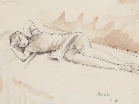 Hans Bendix: Studie af Elsebeth (Casanova). Signeret. Tusch, akvarel og blyant på papir. Lysmål 24 x 32 cm.
