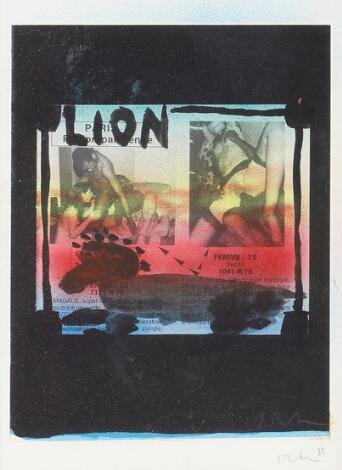 Jens Birkemose: "Lion", 1989. Signeret J. Birkemose 89. Collage og akvarel på papir. Bladstørrelse 25 x 18 cm.
