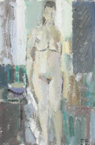 Svend Engelund: Stående nøgen kvinde. Signeret SE. Olie på masonit. 33 x 22 cm.