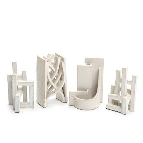 Artist unknown: Fire architectural compositions. Unsinged. White glazed. H. 17.5-19.5 cm. (4)
