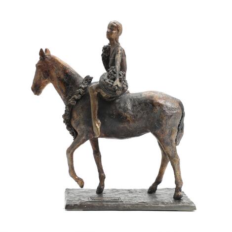 Polish artist, 20th century: A woman at a horse. Stamped. Patinated bronze. H. 34 cm.