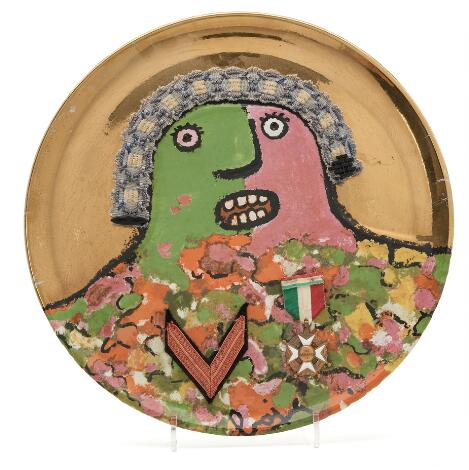 Enrico Baj: “L'ultimo dei Generali”. Porcelain plate with medals and brocade. Diam. 30.5 cm.